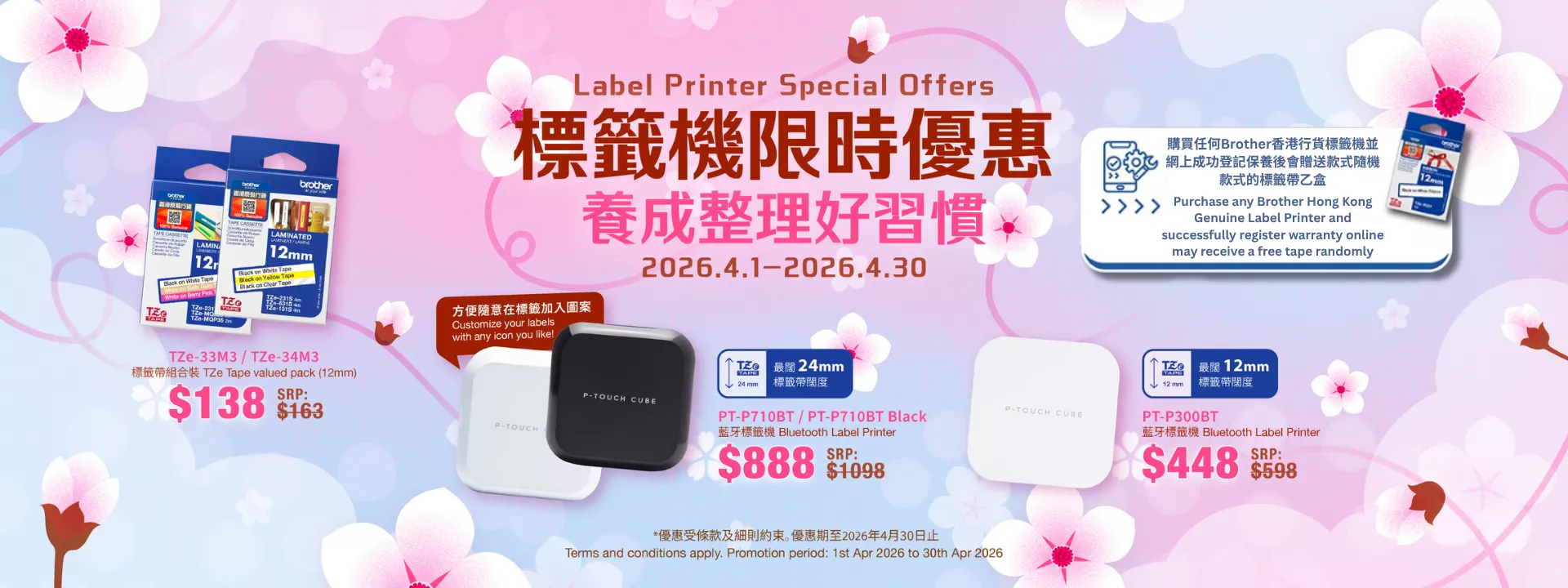 4. From April 1, 2026, to April 30, 2026, customers who purchase any Brother Hong Kong authorized label printer and successfully complete the online warranty registration will receive an email confirmation within 10 working days. Upon confirmation of registration, please provide a valid mailing address. and we will send one piece of TZe tape (randomly selected) via surface mail within 14 working days of receiving the address details.