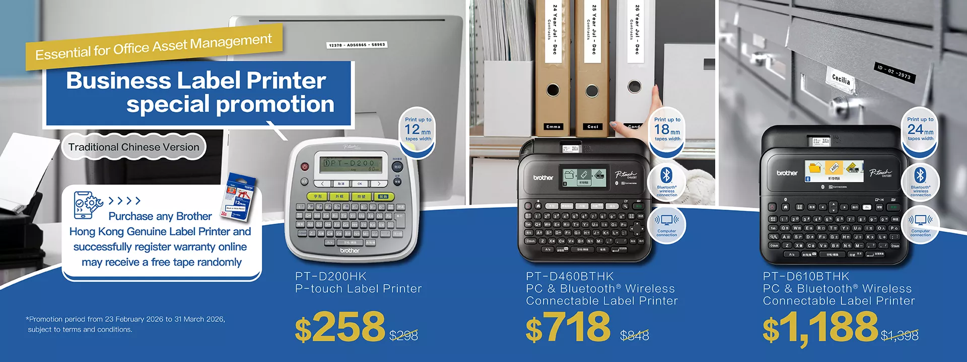 5. From February 17, 2026, to March 31, 2026, customers who purchase any Brother Hong Kong authorized label printer and successfully complete the online warranty registration will receive an email confirmation within 10 working days. Upon confirmation of registration, please provide a valid mailing address. and we will send one piece of TZe tape (randomly selected) via surface mail within 14 working days of receiving the address details.