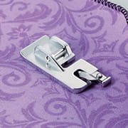 For shell stitch effect while creating a hem on lightweight fabrics. Handy for use when sewing special fabric edges like frills. This foot has a grooved soleplate to provide the correct stitch formation.