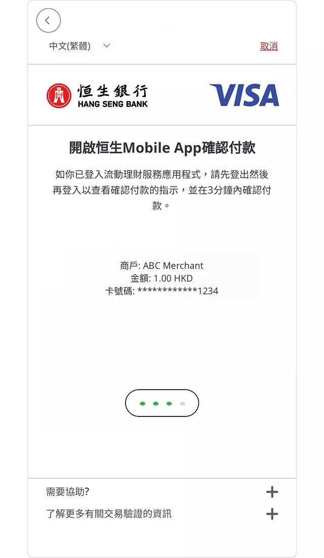 (恒生銀行「無卡支付」交易認證的步驟教學圖片 https://www.hangseng.com/zh-hk/personal/cards/online-spending/secure-shopping/)
