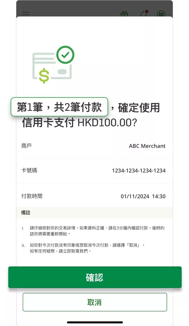 在網上提交任合訂單後,客人如果已安裝了該銀行信用卡的手機應用程式,會立即收到確認通知,到訪該手機應用程式及確定該交易就可以完成訂單,所有的「無卡支付」交易,便無需再收取「一次性密碼」短訊。
