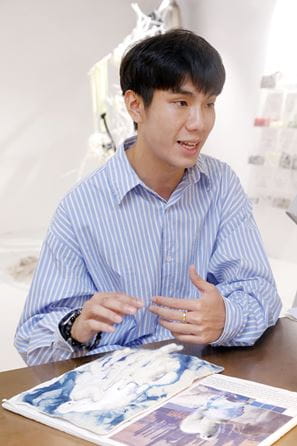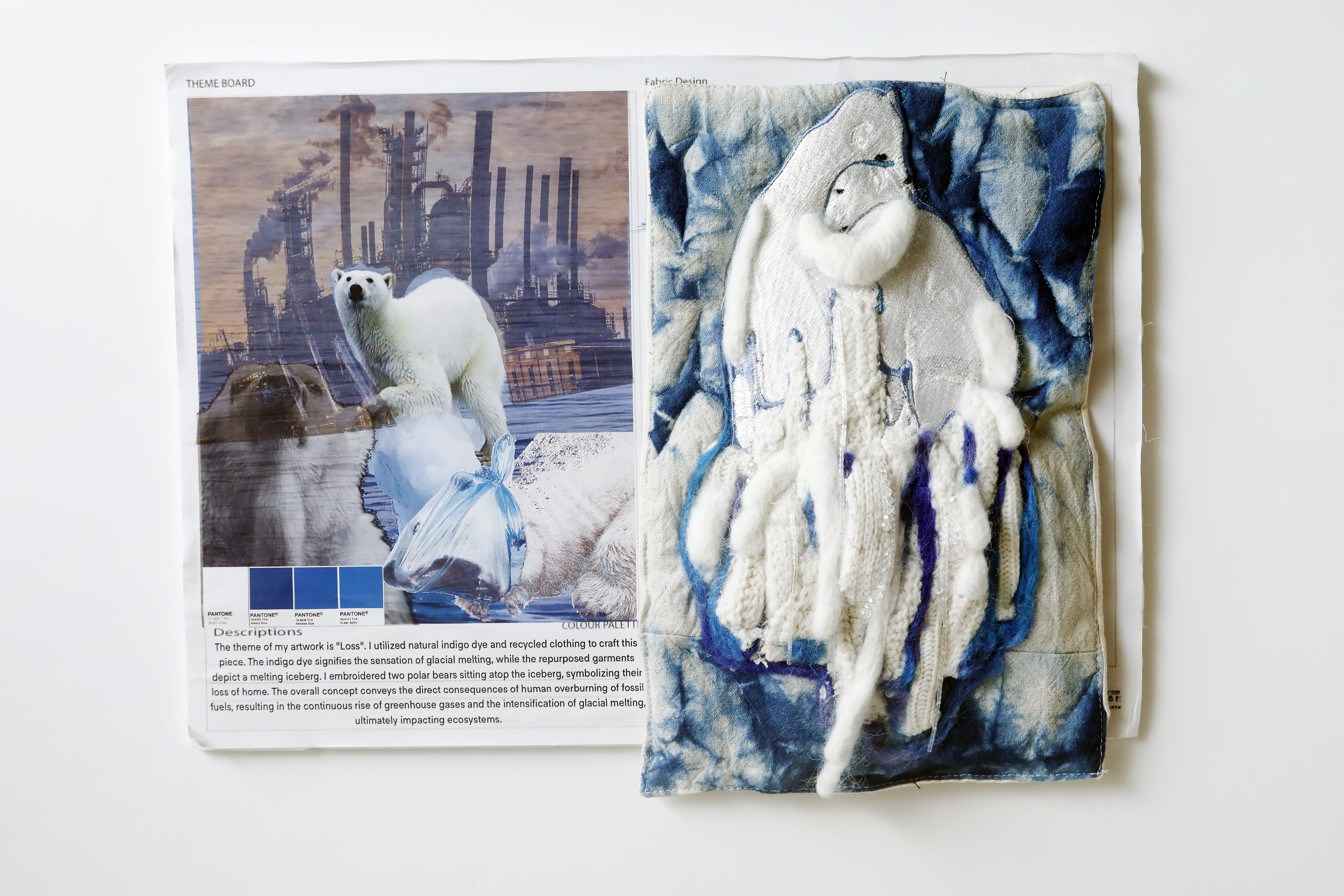 除了主體的北極熊,Alan喜言透過不同布料的技巧運用,更令其作品的整體設計氛圍更上層樓:「例如我使用藍染布料作背景,盼讓人感受到冰川融化的真實感;又例如我收集舊毛衣布料,配上水晶珠串,來營造冰山的立體感,以及光線反射的視覺效果,與主體的北極熊互相輝映。」對此,Roxana也讚揚Alan的作品成功結合自動刺繡機的和人手加工的雙重智慧,在整體設計和可持續概念等比賽標準上,予人深刻印象。