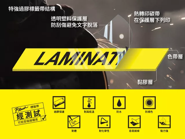 文字是採用夾在兩層PET (聚乙烯膜) 之間的熱轉印專用碳帶印出,能承受嚴苛條件的耐用標籤。