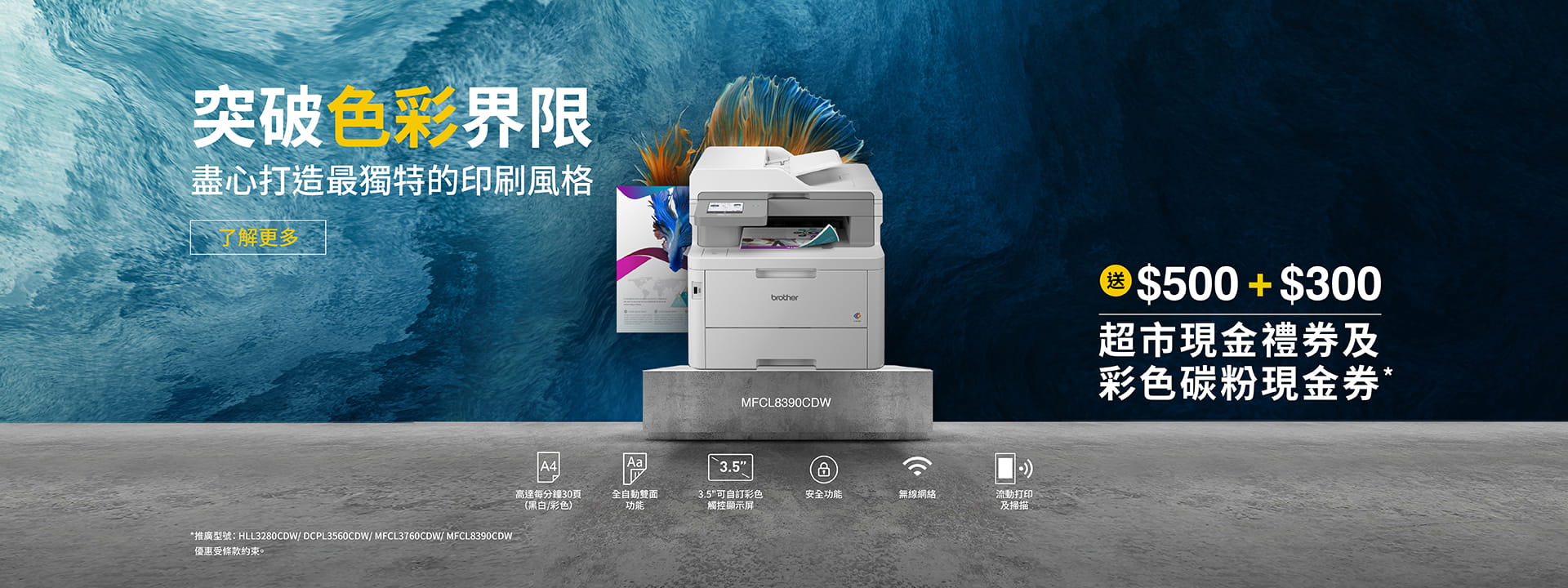 2. 凡購買DCPL3560CDW、MFCL3760CDW或MFCL8390CDW, 可換領$500超市現金禮券及$300彩色碳粉現金券(6張x $50)