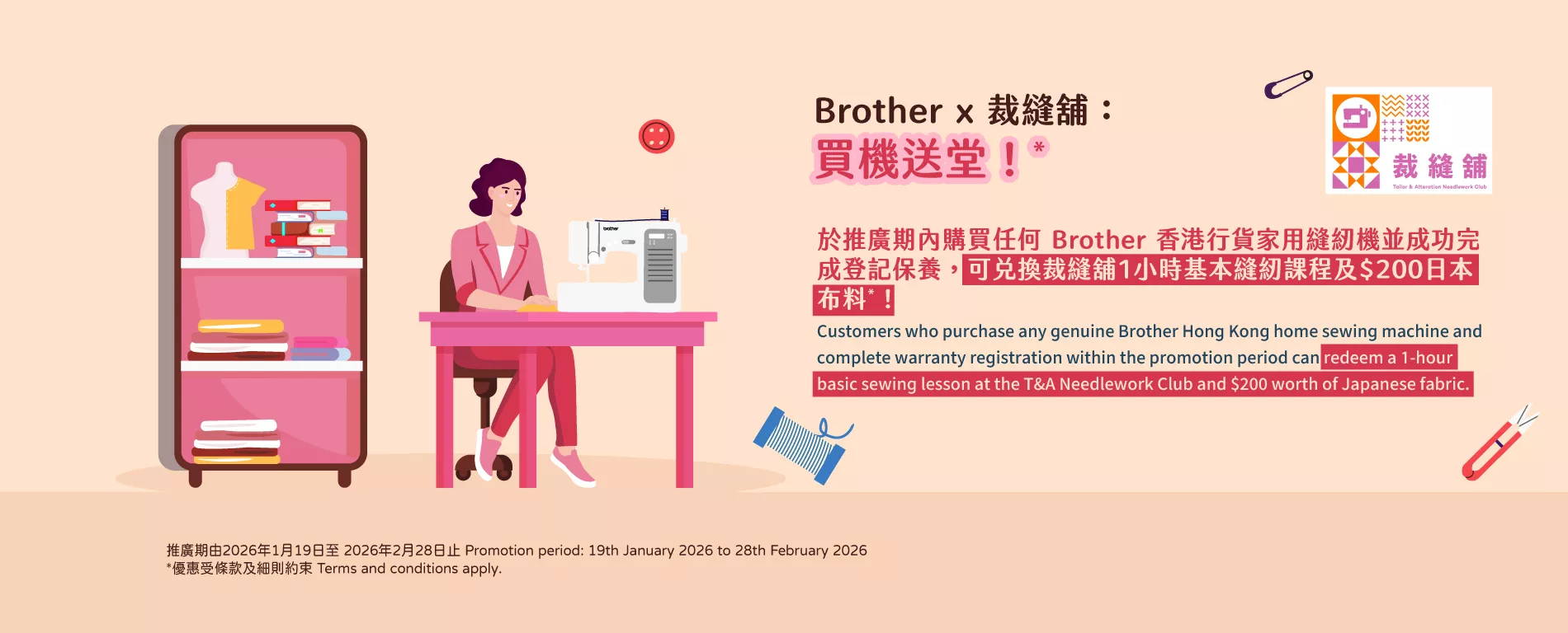 - 於推廣期內購買任何 Brother香港行貨家用縫紉機,並於購買日起計8–30日內完成登記保養,收到保養登記証明電郵後,可聯絡裁縫舖兌換免費價值$200的日本布料及1小時基本縫紉課程。