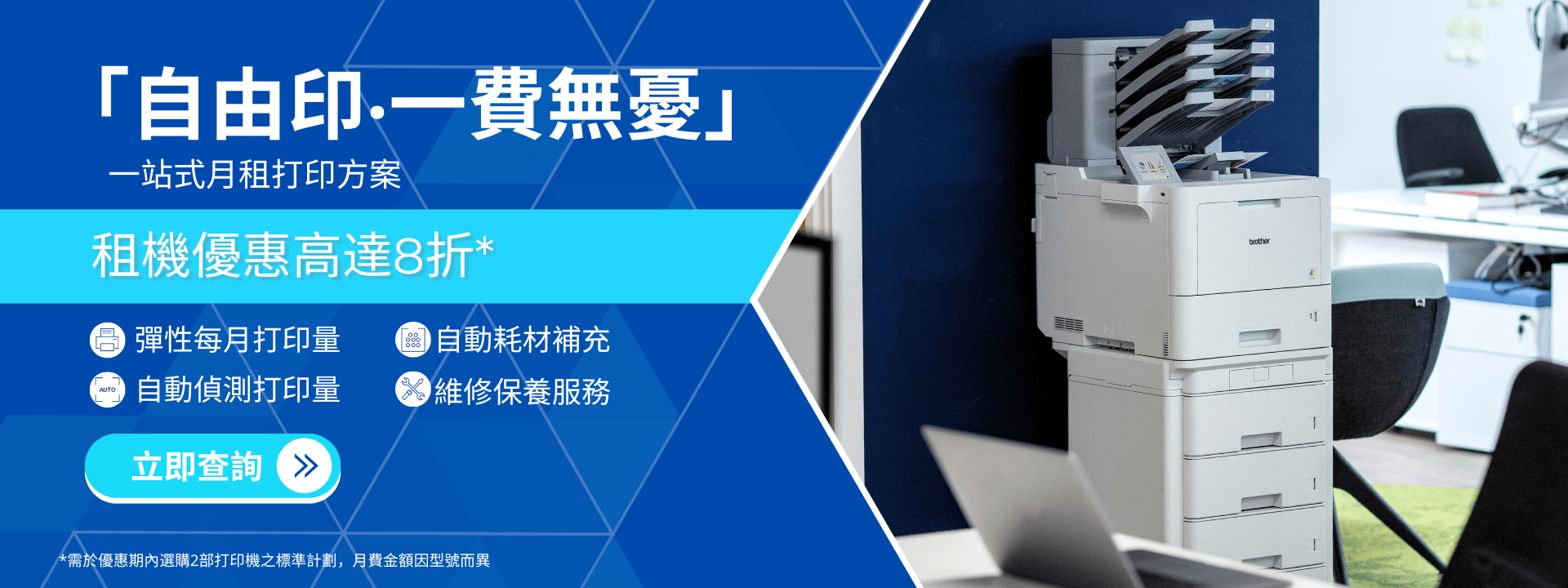 每間公司都需要文件打印,往時只有買機選擇,一下子要買三兩部鐳射打印機,成本開支不少,最麻煩的是要自行管理,又要花人手訂購碳粉以免耗材耗盡而阻礙日常運作。Brother 更一反傳統的租機模式,讓企業多一個選擇,不想前期投資太多又想有自動補充耗材等服務,這是很不錯的選擇。合約期內的印量更可自由調配,計計條數,真心抵用!